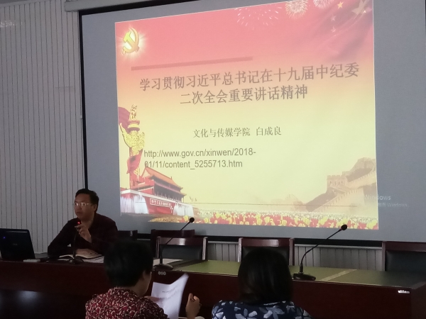 2018年5月30日下午,bv伟德官网于知津楼B523由党总支书记白成良同志讲授党课:主要学习贯彻“习近平总书记在十九届中纪委二次全会重要讲话精神”、“2018年教育部全面从严治党工作会议精神”、“重庆市第五届记录检查委员会会议精神”、党委孙泽平书记“2018年全面从严治党暨党风廉政建设”报告,党委副书记、纪委书记李德全同志的“学校党风廉政建设”工作部署。学院院长、总支副书记李天福、副院长李芹燕,院长助理王长武以及全体党员和教职工参与本次会议。