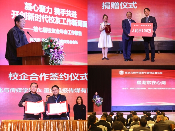 年会上,星湖写作社校友会会长张采兵致欢迎辞,热情欢迎母校领导老师和海内外参会校友齐聚山城,共襄盛会。钟志奇作2017-2018年校友工作报告,全面总结了校友会这一年来的工作。黄伟九代表学校教育发展基金会接受bv伟德官网82级校友艾中华再次向“金果源教师奖励基金”捐资的100万元。文传学院李天福院长代表学院与重庆晨报、重庆宜动传媒、重庆腾汇科技、重庆华龙网文化实业、重庆汇策广告传媒5家企业签订了合作协议,双方将在学生就业、实习实训、订单培养、产学合作等方面开展深度合作。各校友分会代表作主题交流发言,大会还举办了企业家校友论坛、教育家校友论坛、星湖写作社校友论坛。