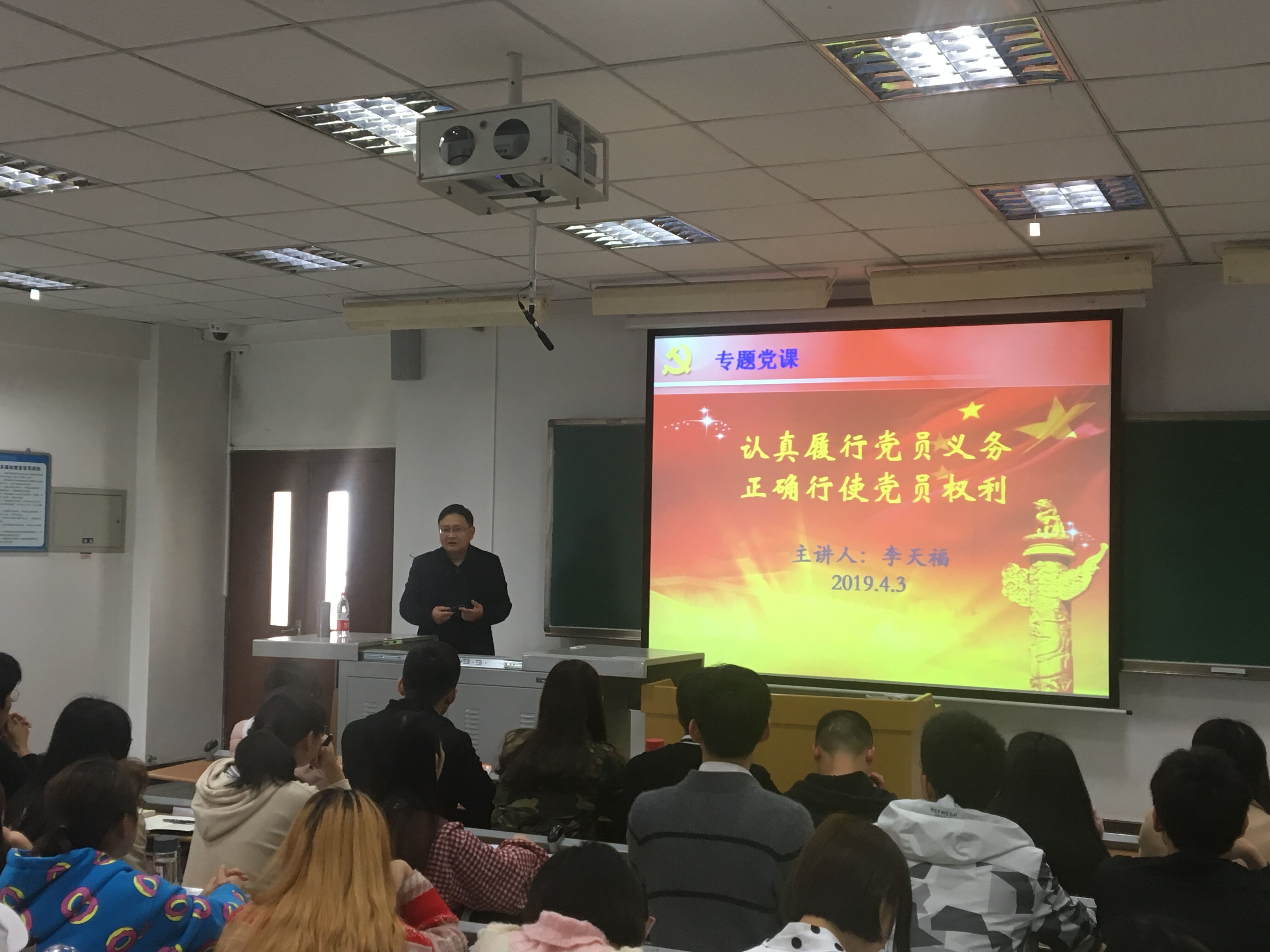 43日下午,bv伟德官网在知津楼D304开展了以“认真履行党员义务,正确行使党员权利”为主题的专题党课。院长李天福为党校学员和本期发展对象授课。