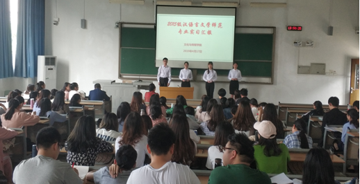 2019417日下午,2015级汉文师范专业实习汇报暨2016级汉文师范专业试讲领航课在知津楼7阶隆重举行。文化与传媒学院副院长李芹燕、中文系主任黄贤忠、语文教育教研室主任李东平等15名试讲指导教师、42015级优秀学生代表以及2016级汉文师范全体学生参加了本次汇报。