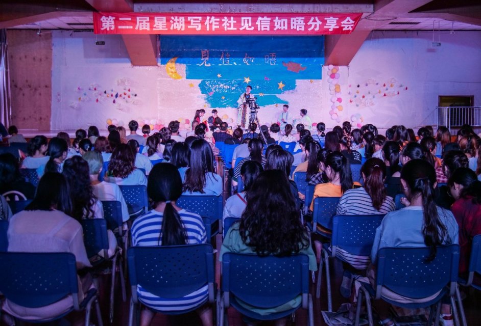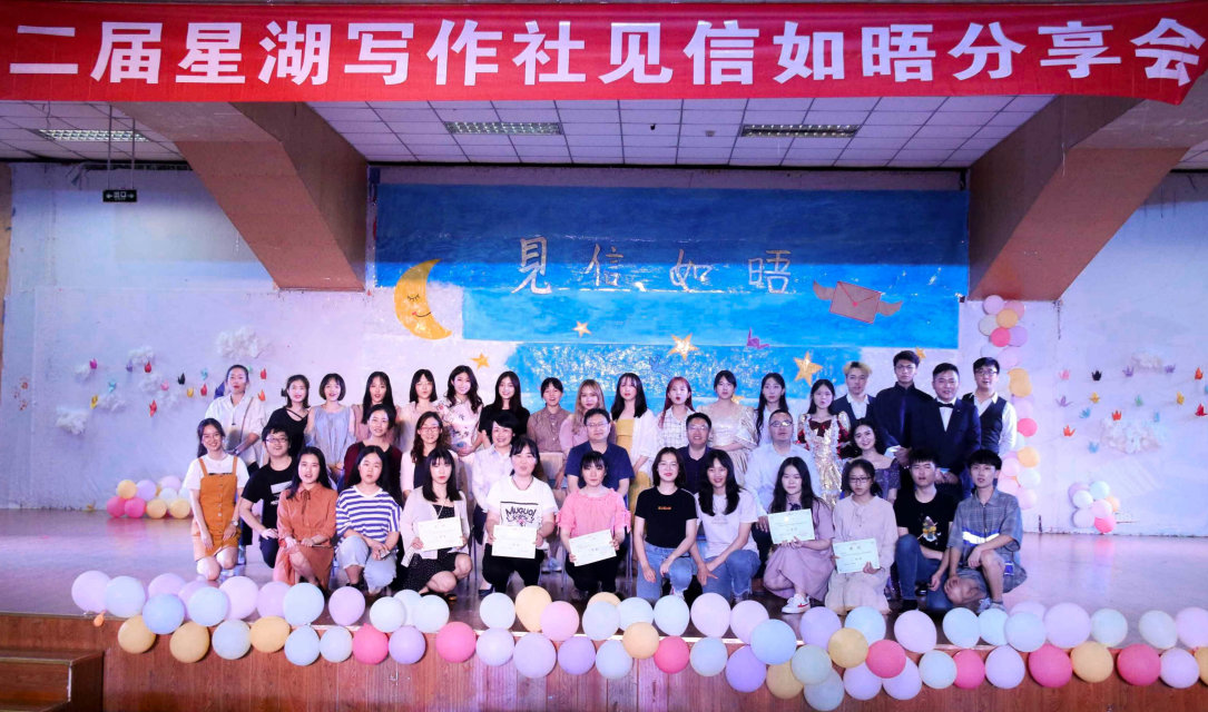 2019年4月24日晚上7点,星湖写作社见信如晤分享会暨第二届见信如晤大赛在红河A区活动中心三楼举行。参加此次活动的领导及老师有文化与传媒学院党总支书记、星湖写作社顾问白成良;文化与传媒学院院长、星湖写作社顾问李天福;文化与传媒学院副院长、星湖写作社指导老师李芹燕;校团委陈柏骏老师;文化与传媒学院团总支书记刘友洪以及文化与传媒学院2015级辅导员张雪、2017级辅导员张梓涵。