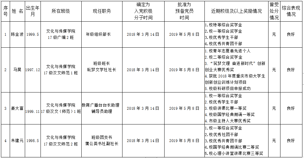 公示期7天,自2019年5月8日—2019年5月14日。公示期间对陈金波等同志在发展期间的现实表现或党组织对其培养考察程序有需要反映的问题,请及时以口头或书面的形式向所在党支部反映,也可直接向校党委组织部反映,我们将为您严格保密。