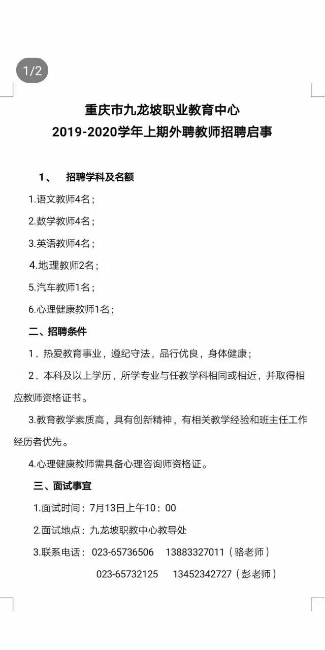 重庆市九龙坡职业教育中心招聘启事