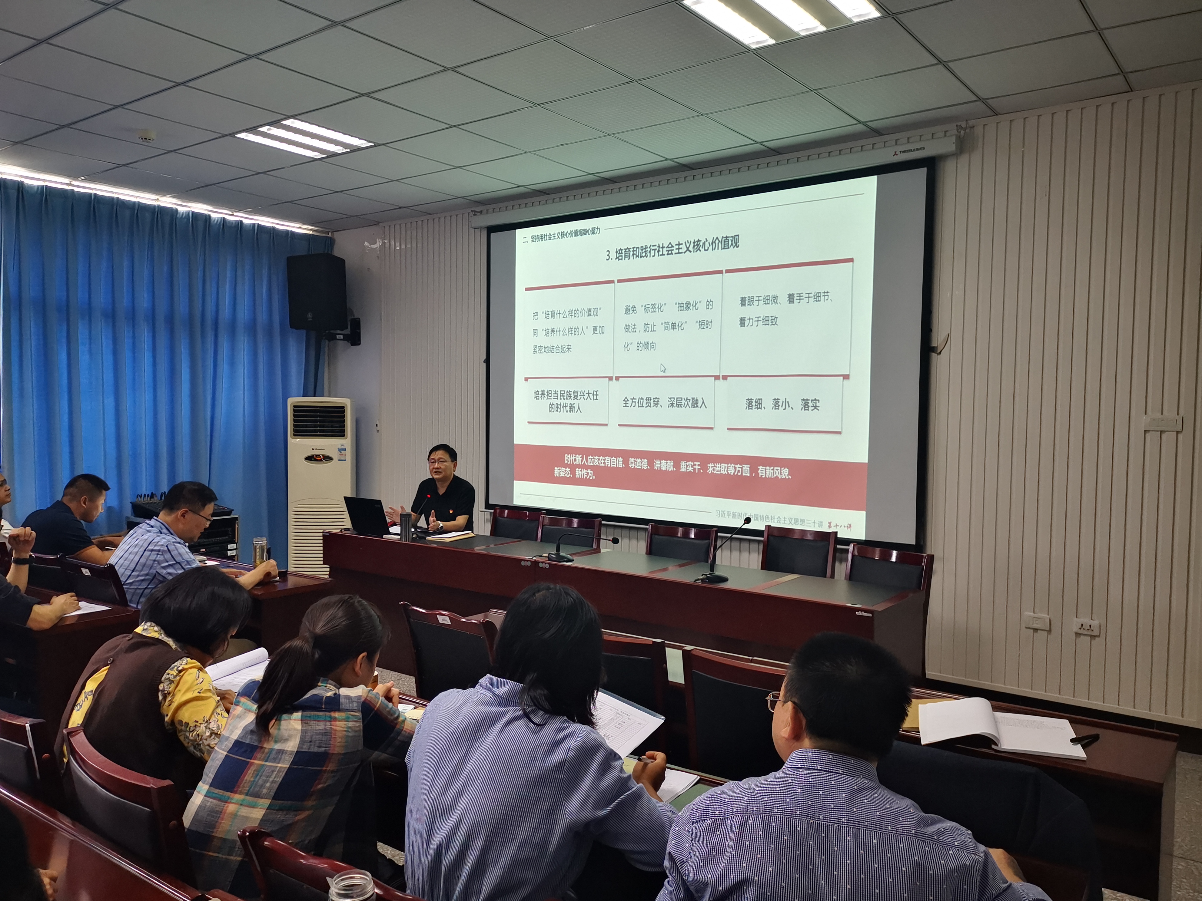 李天福结合学院工作实际,深入浅出地讲解了《习近平新时代中国特色社会主义思想三十讲》之第十八讲“推动社会主义文化繁荣兴盛”,包括“文化自信是更基本、更深沉、更持久的力量”“坚持用社会主义核心价值观凝心聚力”“加快构建中国特色哲学社会科学”“提高党的新闻舆论传播力、引导力、影响力、公信力”“进行无愧于时代的文艺创造”“推动中华优秀传统文化创造性转化、创新性发展”“提高国家文化软实力”等七个方面,指出发展中国特色社会主义文化,就要坚决贯彻党中央决策部署,坚定文化自信,增强文化自觉,坚持走中国特色社会主义文化发展道路,激发全民族文化创新创造活力,建设社会主义文化强国。