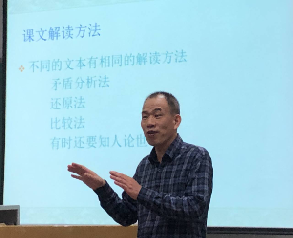 课堂伊始,蒋老师向同学们抛出这样一个问题:教师为什么要解读课文?在同学们发表过自己的看法之后,蒋老师提出,如同5G是华为的核心技术,课文解读就是语文教师的“核心技术”,更是一项基本功,是自我能力与课堂教学能力提升的需要。这让坐在台下的未来的准教师们对课文解读这项“核心技术”有了一个清晰直观的认知。随后,蒋老师向同学们传授了提高课文解读能力的重要方法之一——背诵。几十年如一日每天早上六点二十到学校背书的励志经历使同学们感到震惊及由衷的敬佩。最后,蒋老师以多篇中学课文为例,依次向同学们介绍讲解了矛盾分析法、还原法、比较法等课文解读方法,结束了本次别开生面的课堂。