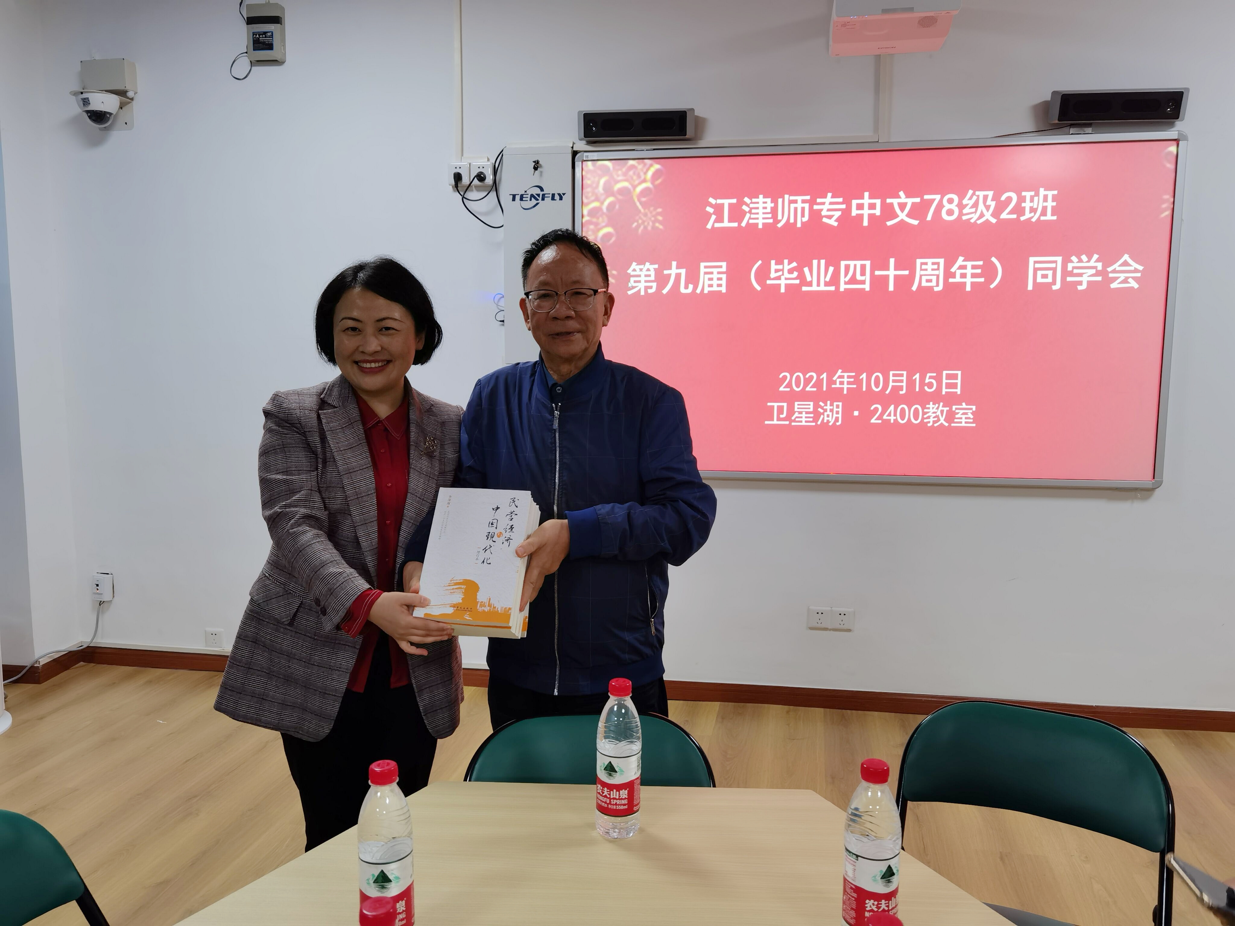 四川大学教授、中组部党建研究员李济琛校友向学院捐赠了学术专著,叶圣陶杯全国教师文学作品征集大赛一等奖获得者重庆一中语文高级教师邓晓燕校友向学院捐赠了获奖诗集。两位校友对母校三年的培养表示由衷的感谢,对78级全体同学们的支持表示感谢。