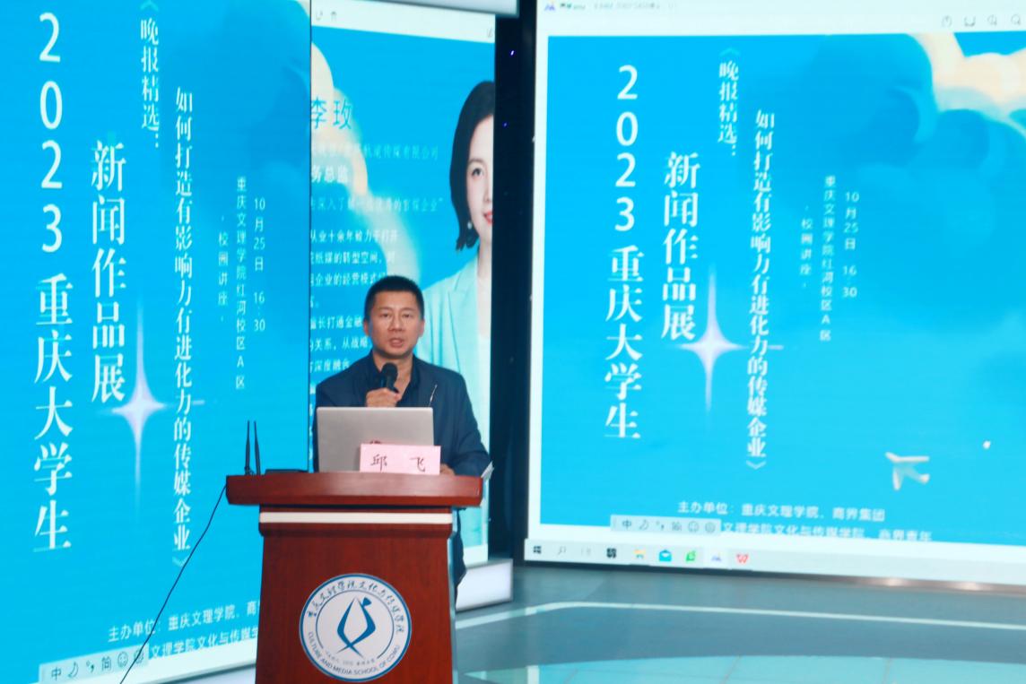 邱飞首先致欢迎词,然后介绍了李玫的重要业绩及经历,讲述了本次讲座的背景意义,引导传媒学子要跳出传统的专业思维,从经济等新角度去认识传媒行业。强调,从经济方面和创新创意方面来理解传媒是一个新颖的角度,发展创新思维、创新能力,这也顺应了时代和行业的发展。同时,学生应从多角度认识世界,从多角度挖掘自己的潜能,找准自己的定位。他表示,由bv伟德官网和商界集团共同开展的重庆大学生新闻作品展大赛获得了重庆多所高校的大力支持,各校学生参赛活跃度高。希望能通过与商界集团联合举办重庆大学生新闻作品展评选活动提高同学们对主流媒体的认知,培养同学们新闻采写等多方面的能力。