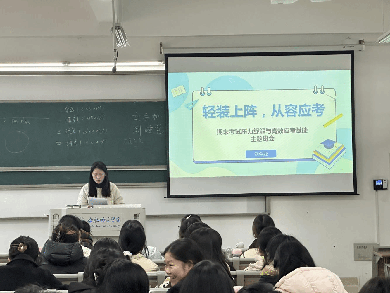 在互动环节,班会设置了“夸夸联盟”“压力涂鸦墙”等趣味活动。学生通过匿名书写困惑、集体情绪释放等形式,打破心理隔阂,实现情感共鸣与压力宣泄。辅导员还现场讲解并带领练习“深呼吸放松法”“54321感官稳定法”等实用心理调适技巧,帮助学生在紧张备考中即时缓解焦虑。
